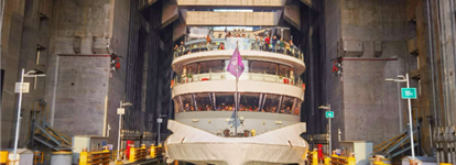 07:30-13:30自选乘坐【三峡升船机】(290元/人)的嘉宾换乘观光船(携带行李换乘观光船,翻越大坝后,在大坝下游三斗坪码头,导游接船,再换乘旅游大巴,前往游览【三峡大坝风景区】(电瓶车和耳麦40元/人自理)。